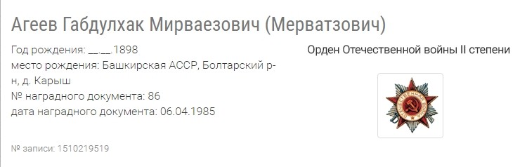 Глава династии Габдулхак Мирваизович Агеев родился в деревне Нижнекарышево Уфимской губернии 1898 году. В возрасте двенадцати лет оказался в Сибири. Семья была большая. Окончил медресе в городе Тара, это в Омской области. Вырос, женился на дочери таких же переселенцев, как и он. Вначале переселенцы держались вместе, не смешивались с местным населением, только перед Великой Отечественной войной переехав в райцентр – село Кыштовка, произошло смешивание.