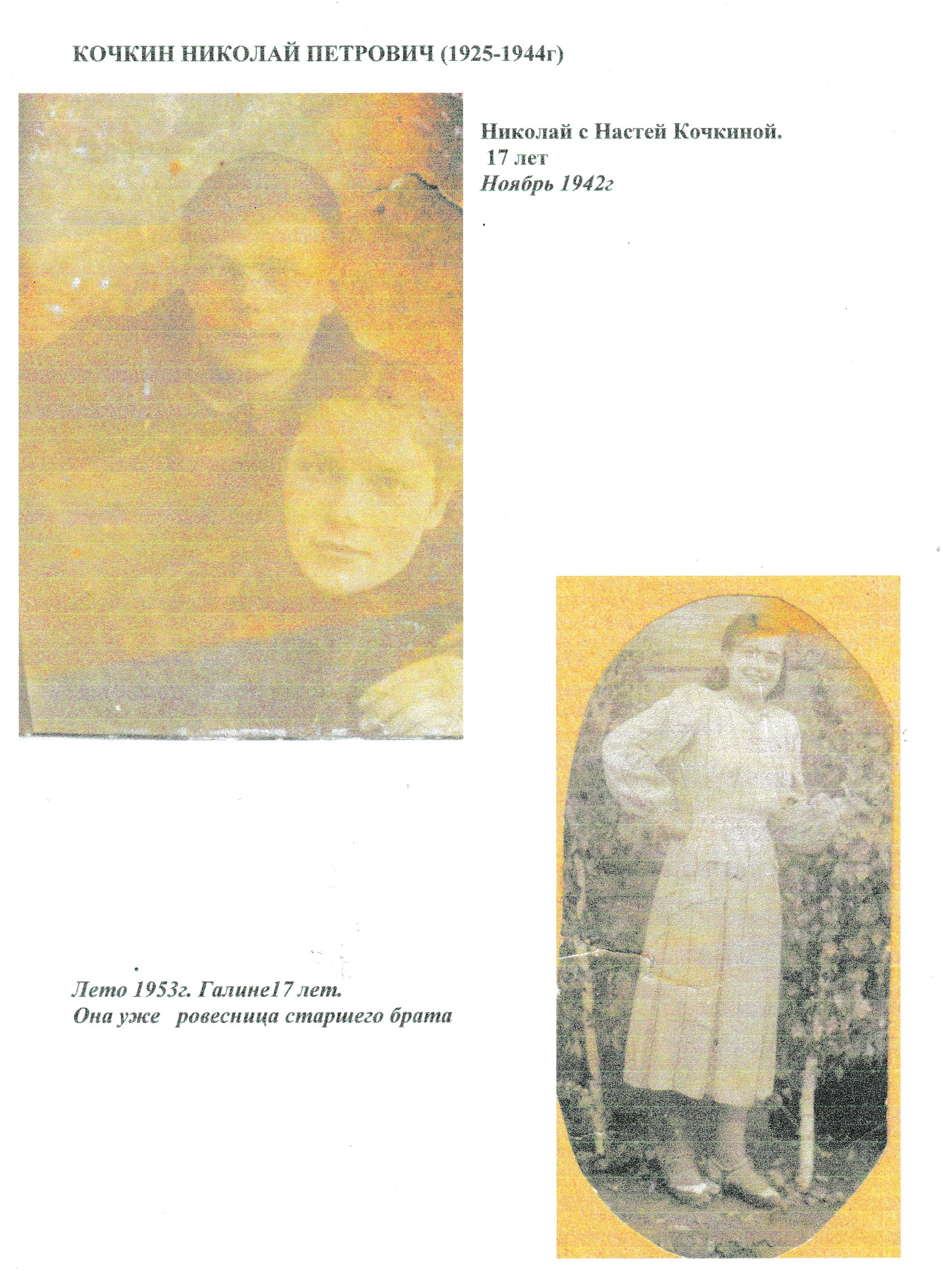 В 1943 году на фронт ушёл мой старший брат Николай. Было это в январе, тогда стояли сильные морозы. На прощание он сказал мне: «Расти, будь здоровой, ты самая любимая моя цыганочка». Так называл он меня за карие глаза и тёмные волосы. Ему было 18 лет. Николая вначале отправили в полковую школу. Как то мы с бабушкой отправились в город, чтобы проводить его на фронт, но опоздали.