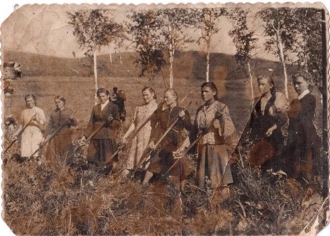 Женщины целый день в поле. Усталые, голодные, некоторых от взмаха косы бросало в сторону. Сядут обедать, развяжут узелки, а хлеб не у всех, в основном три–четыре картофелины и забеленный молоком травяной чай.