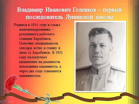 Лунинская школа машиниста ГоленковаВладимир Иванович Голенков родился в 1914 году в семье рабочего железнодорожника станции Барабинск.