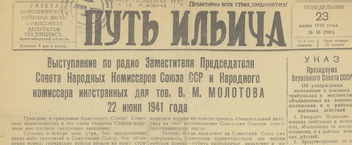 На следующий день, 23 июня 1941 года вышел номер районной болотнинской газеты «Путь Ильича», полностью посвященный нападению Германии на Советский Союз. На первой странице выделялся текст вчерашнего радиообращения Молотова «Выступление по радио Заместителя Председателя Совета Народных Комиссаров Союза СССР и Народного комиссара иностранных дел тов. В.М.Молотова 22 июня 1941 года». Рядом были напечатаны три указа Президиума Верховного Совета СССР от 22 июня 1941 года: «О мобилизации», «Об объявлении в отдельных местностях военного положения», «О военных трибуналах».