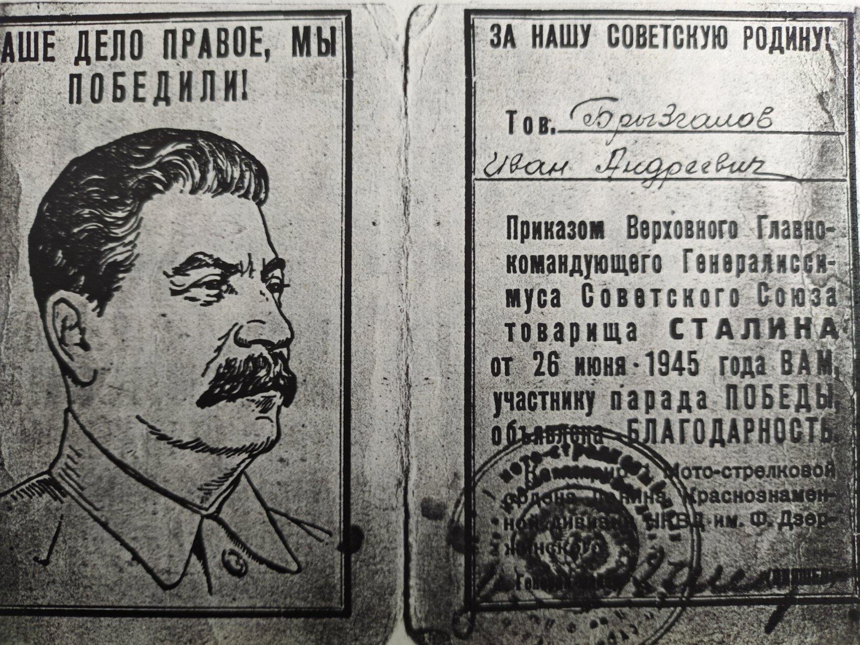 Иван Андреевич долгое время не рассказывал о своем участии в Параде Победы. Однажды, в районном доме культуры на мероприятии, посвященном годовщине Дня Победы, докладчик объявил, что в районе уже нет в живых участников Парада Победы, попросив почтить память о них стоя. Зал встал, а когда все сели, Брызгалов остался стоять на месте. Состоялся диалог докладчика и Ивана Андреевича. «А вы что стоите? Садитесь». «Я участник Парада Победы. И я еще живой». Выяснилось, что ветеран действительно участник Парада 1945 года, о чем свидетельствовало удостоверение-благодарность: «Тов. Брызгалов Иван Андреевич. Приказом Верховного Главнокомандующего Генералиссимуса Советского Союза товарища Сталина от 26 июня 1945 года Вам, участнику Парада Победы, объявлена благодарность. Командир 1-й Мото-стрелковой ордена Ленина Краснознаменной дивизии НКВД им. Ф.Дзержинского генерал-майор Пияшев».