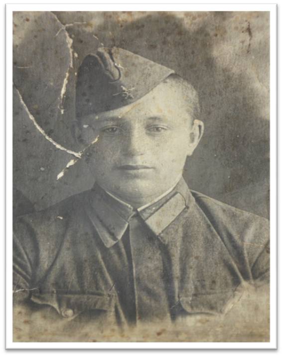 В июне 1941 года прадедушка был призван по мобилизации Кыштовским райвоенкоматом в 444 стрелковый полк – стрелком. В сентябре 1941 года он был тяжело ранен в грудь, осколок попал в лёгкое. До февраля 1942 года находился в госпитале на лечении. Дальше свой боевой путь продолжил в 197 отделении дорожно-строительного батальона – был шофёром.
