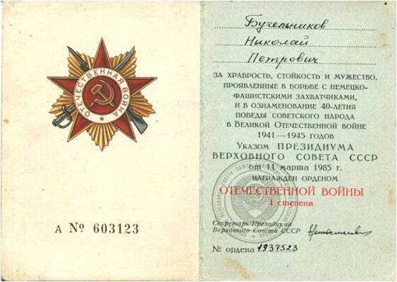 Великая Отечественная война – это один из самых героических периодов истории советского народа, время не только бедствий, но и время всенародного подвига. Не было ни одной семьи, из которой кто-либо не ушёл на фронт. Не обошла стороной война семью Бучельниковых Петра и Афимьи, семью моих предков.В 1941 году они вместе с детьми (Наталья, Николай, Олимпиада, Геннадий) проживали на полуострове Тёмный, расположенном на территории озера Чаны Купинского района Новосибирской области. На тот момент это была крепкая семья, в которой дети были взрослого возраста. Моему дедушке, Николаю Петровичу, в мае 1941 года исполнилось 19 лет.