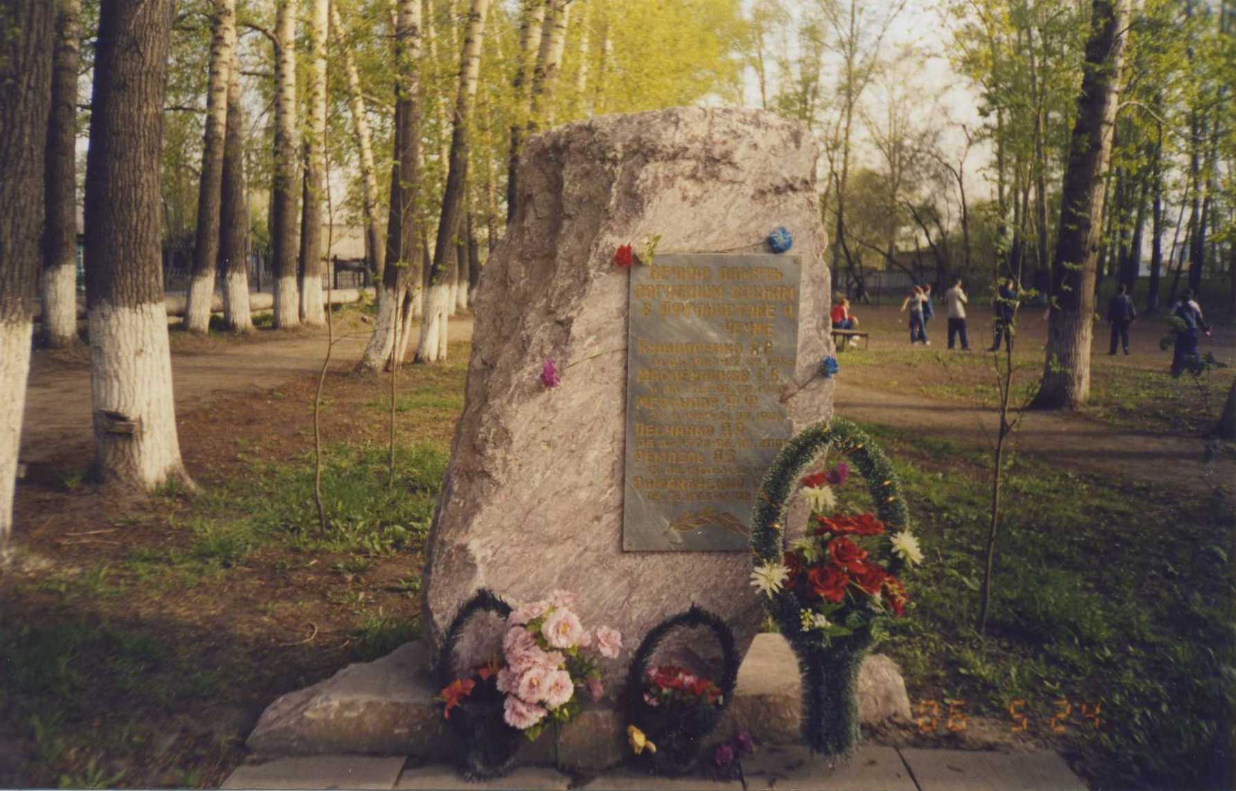 Памятник установлен лицевой частью на юг и представляет собой большой камень светло-коричневого цвета, на фасадной стороне которого закреплена металлическая табличка стального цвета с надписью золотыми буквами: «Вечная память погибшим воинам в Афганистане и Чечне. Кушнаренко А.В., Масленников С.В., Меркулов Ф.Ф., ПесчанкоА.А., Ремпель А.В., Романовский С.И.» Внизу таблички изображена склонённая лавровая ветвь.