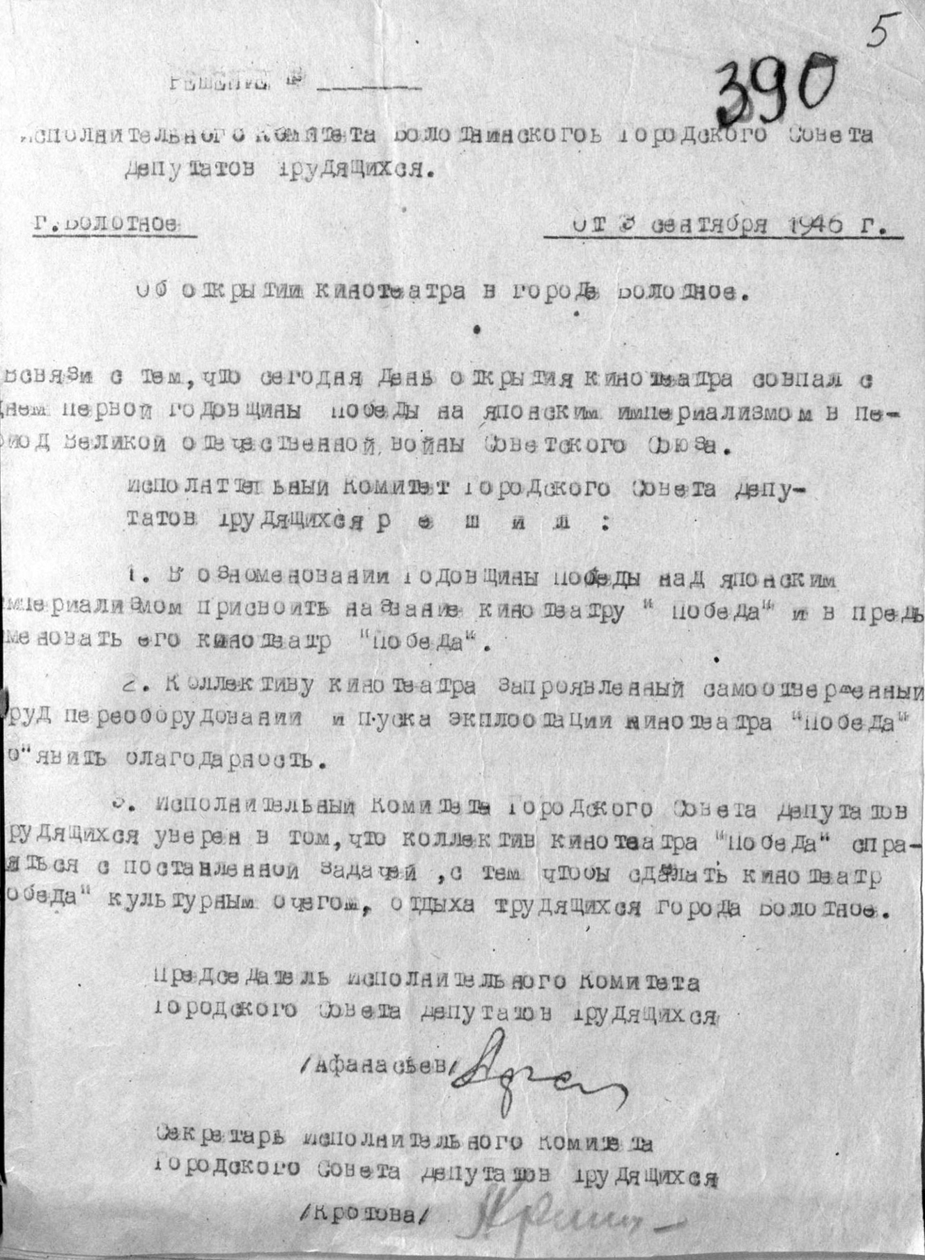 В связи с тем, что сегодня день открытия кинотеатра совпал с днём годовщины Победы над японским империализмом в период Великой Отечественной войны Советского Союза, Исполнительный комитет городского Совета Депутатов трудящихся решил: